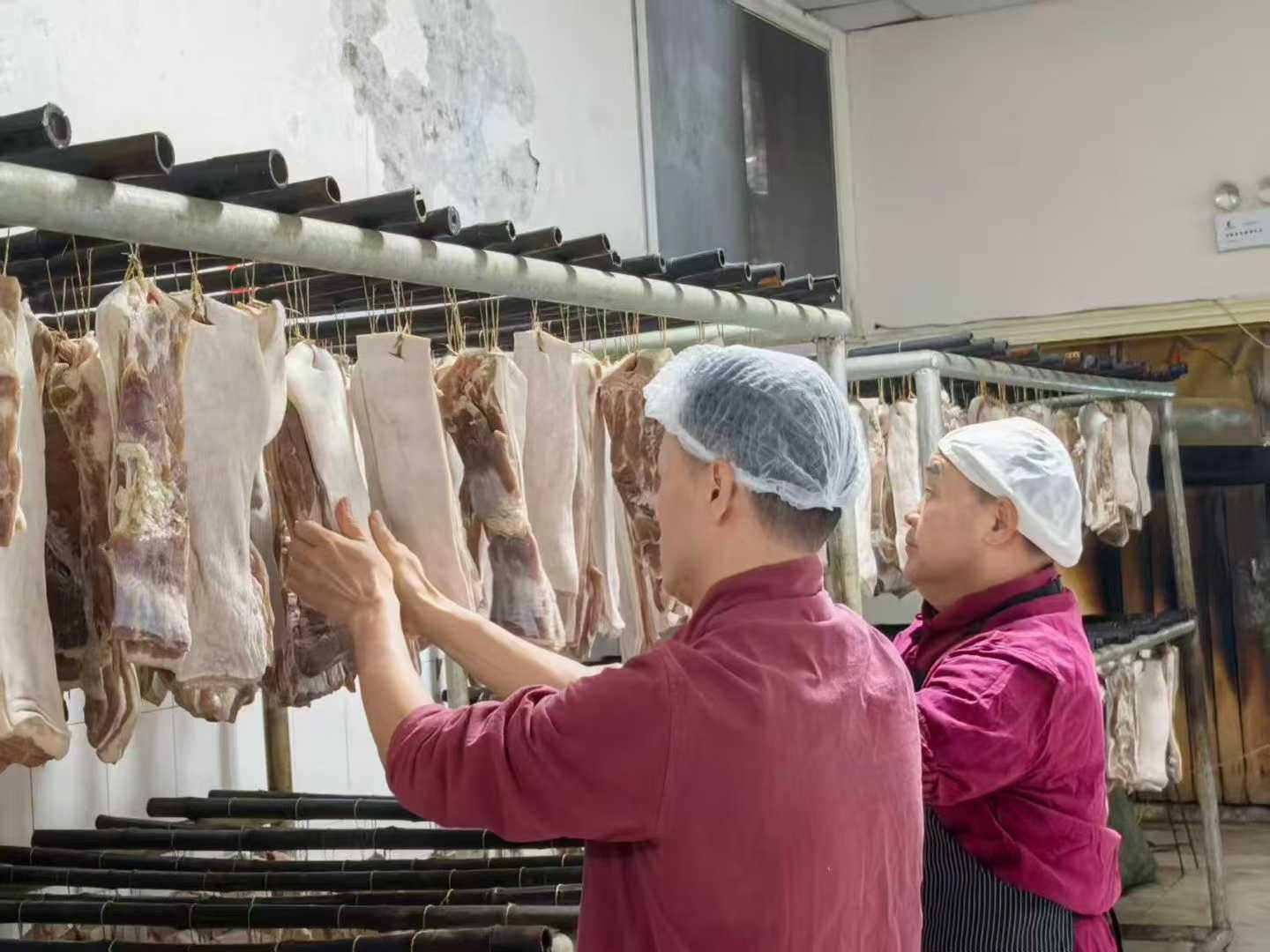 做藏香黑豬臘肉,我們還是守著老規(guī)矩來!精選豬五花、后腿肉這些好部位,用自貢井鹽搭配本地花椒、桂皮手工揉腌,腌夠7天再翻一次身,確保每一寸肉都吸滿香料味。之后掛起來曬足山風(fēng)日曬,最后進烘房用松柏、橘皮文火慢熏20多個小時,沒有任何添加劑,全靠時間和手藝沉淀出醇厚臘香。